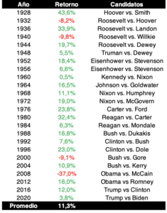 Desde 1928 hasta el 2016, se han verificado 23 elecciones presidenciales en Estados Unidos. El S&P 500 ha rendido, en promedio, un 11,3% en años electorales. Y solo en 4 de los 23 de estos años, el mercado ha dado resultados negativos, destacándose el 2008 que se encontraba atravesado por la grave crisis de las hipotecas subprime.